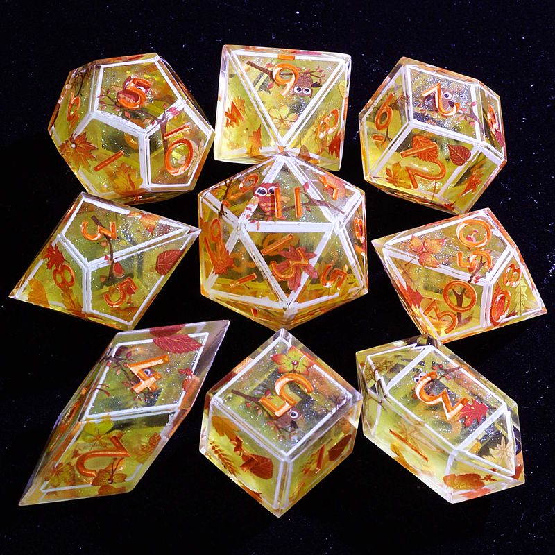 This DND dice set is named "Amber Owl's Covenant Dice", where every roll carries the wisdom of moonlit forests and autumn's last sigh. When your circle of the talon druid communes with ancient tree spirits or your owl-familiar warlock negotiates twilight pacts, these dice don't fall—they glide like falling leaves caught in an updraft, their honeyed resin glowing with captured sunset while suspended maple leaves tremble in invisible currents. That silent pause before landing? The Great Owl blinking once to judge your choices.