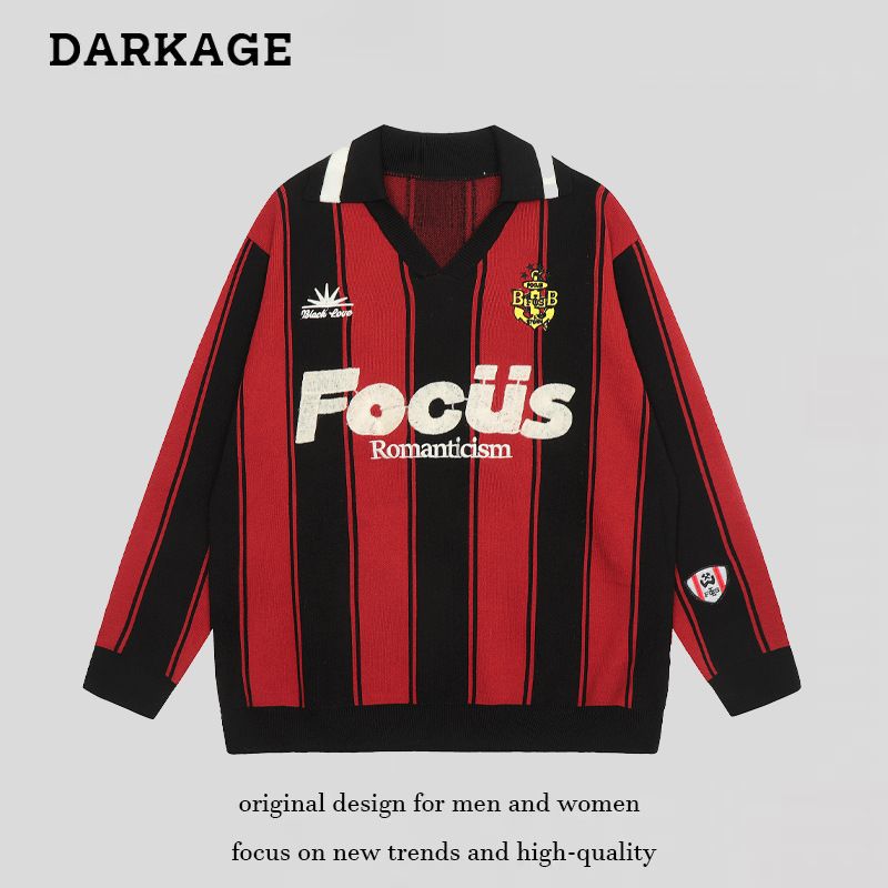 American Trendy Brand Letter Jacquard Color-Block Vertical Stripe Sweater Men's Sports Lazy Style Turn-Down Collar