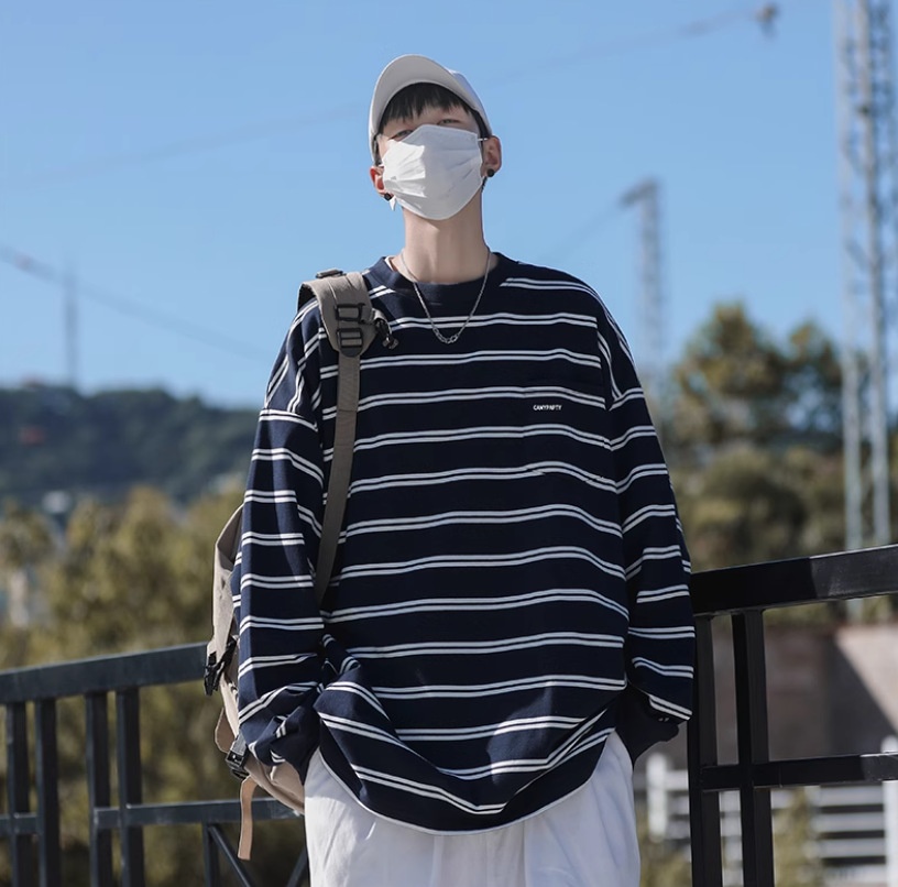 boy Hong Kong Japanese Striped Long Sleeve T-Shirt Trendy Brand Cool Style Men's Spring Autumn Base Shirt Ins Trend High