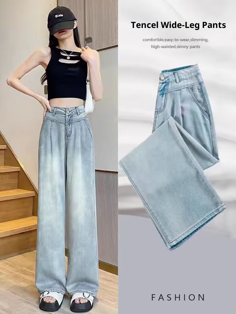 Item Number:Xintang#B02,Brand:Royal Grandeur,Fabric Name:Tencel,Main fabric composition:Tencel Lyocell Fiber,Main fabric material composition 2:Tencel,Design:Straight-leg Pants,The length of the pants:Long Pants,Waist Shape:High-waisted,Thickness:Average,Trendy Elements:Pocket,Year/Season of Release:2025 Summer,Color:Light blue T8853,Size:S,M,L,XL,XXL,3XL,Style Type:Street Style Influencer,Main fabric ingredient content:80% included - 90% excluded,Style:Trendy Style,Elasticity:Non-elastic,Pants Style:Wide-leg pants,Cross-border Style Type:Comfortable and casual,Is it cross-border sourcing?:yes,Product Category:Jeans,Main fabric component 2 content:80% included - 90% excluded,Craftsmanship:Non-iron treatment,Main Downstream Sales Regions 1:European and American,Main downstream sales regions 2:Southeast Asia