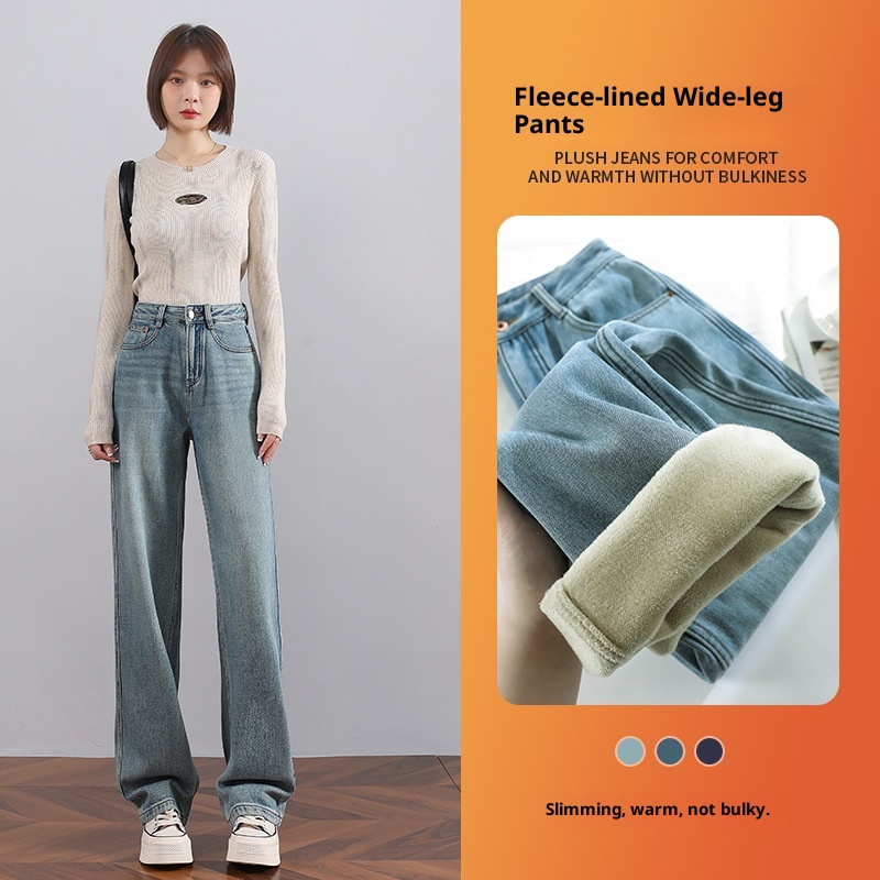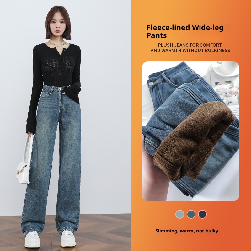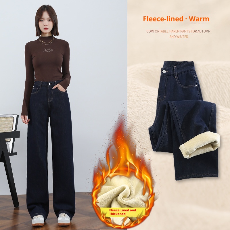 ChicShe American Style Dark Blue Fleece-Lined Jeans Women, New Autumn And Winter Design, Slim Fit Narrow Straight Pants For