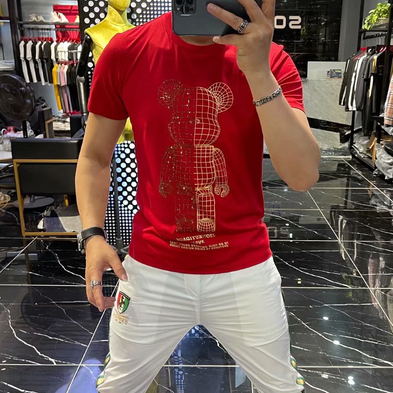 European Summer New Bear Hot Diamond Round Neck Half Sleeve High Street Fashion Casual Cartoon Short Sleeve T-shirt Pullover Men's Wear