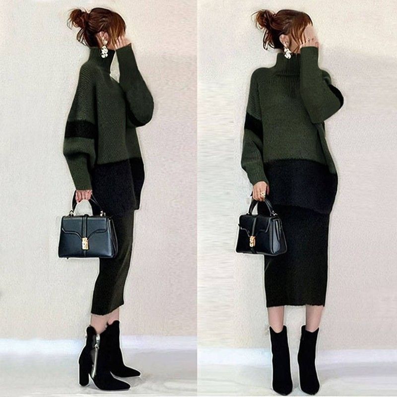 In Stock Japanese Style 2025 New Original Niche Color-Block Knitted Turtleneck Sweater + Skirt