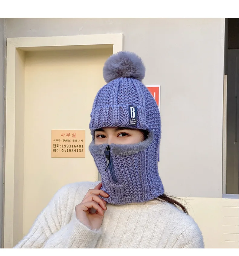 Women Wool Knitted Hat Ski Hat Sets Windproof Winter Outdoor Knit Thick Siamese Scarf Collar Warm Keep Face Warmer Pompoms Cap