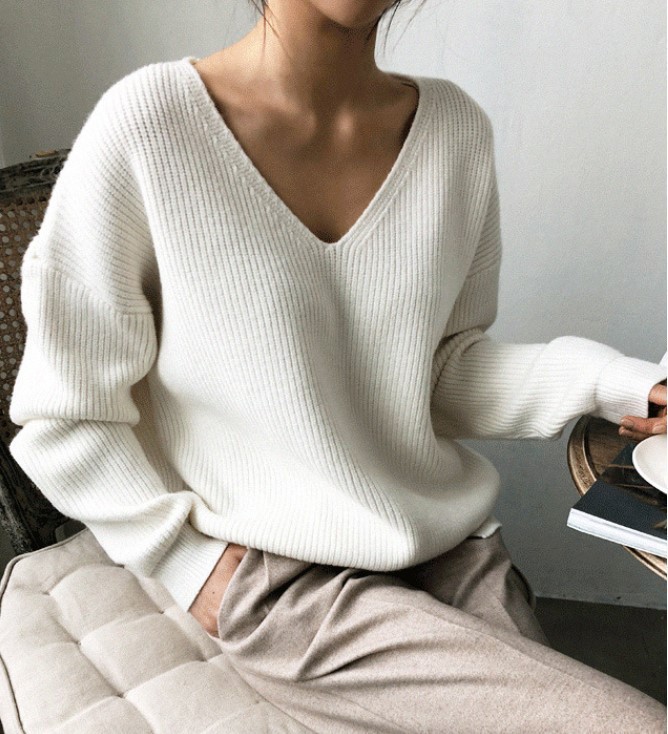 Naisten V-aukkoinen, olkapäät paljastava, kierretty yksivärinen neulepusero